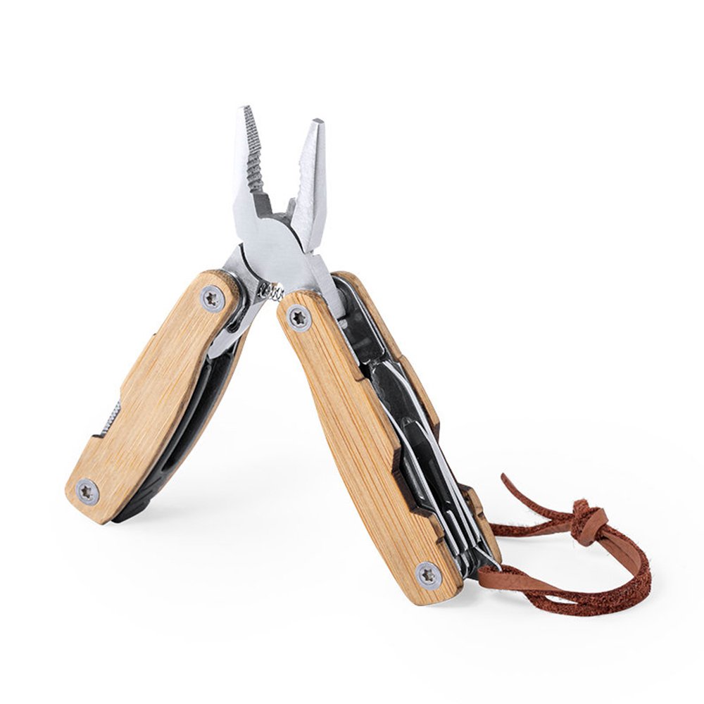 Herramientero 9 funciones en acero inoxidable con cuerpo en madera de bambú, con estuche en lona. De 7 x 3.1x 2.cm cerrado.