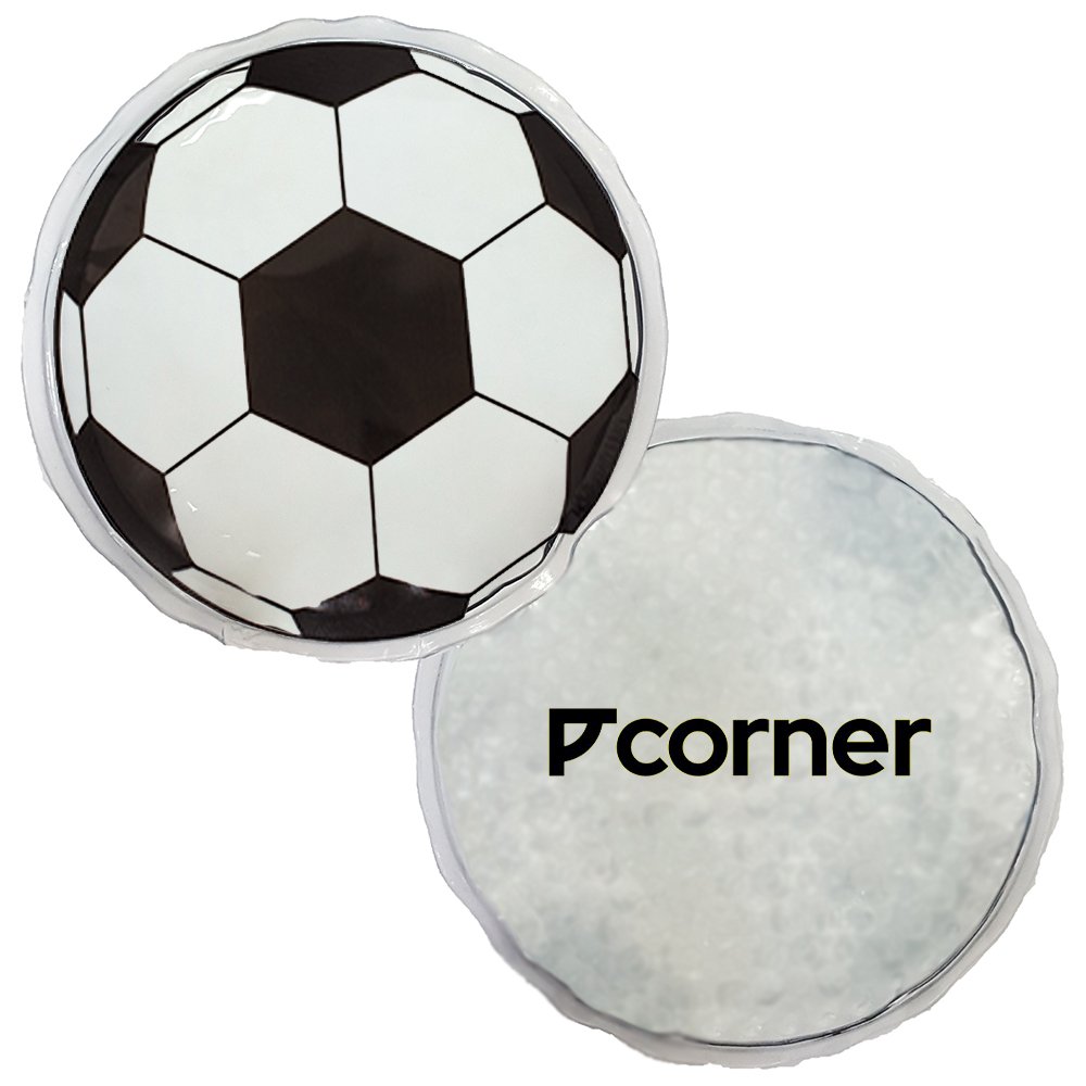 Compresa en PE rellena en gel térmico apto para frio y calor. Estampado de balón de fútbol. De 10 x 10 cms.