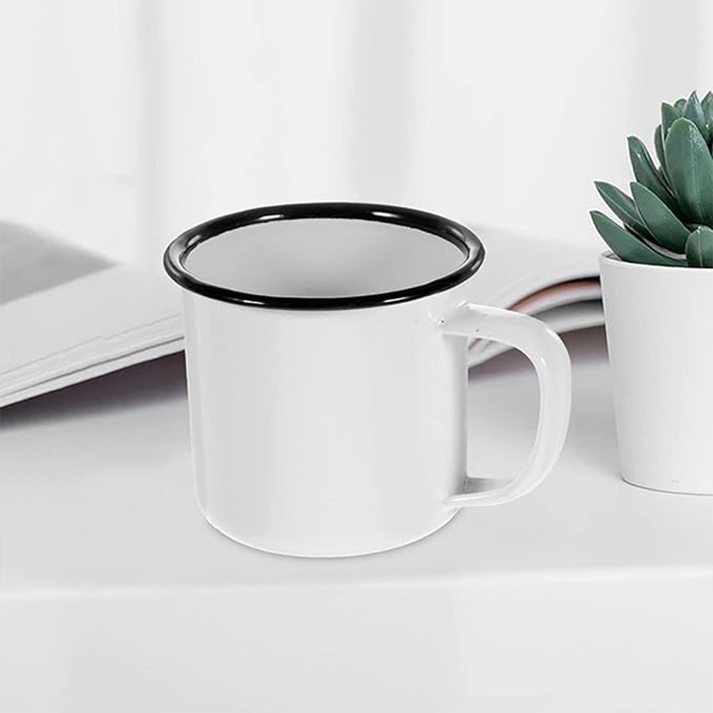Mug metálico esmaltado estilo vintage con imperfeccciones como rayones y desgastes. Interior y exterior blanco con línea contorno negro.