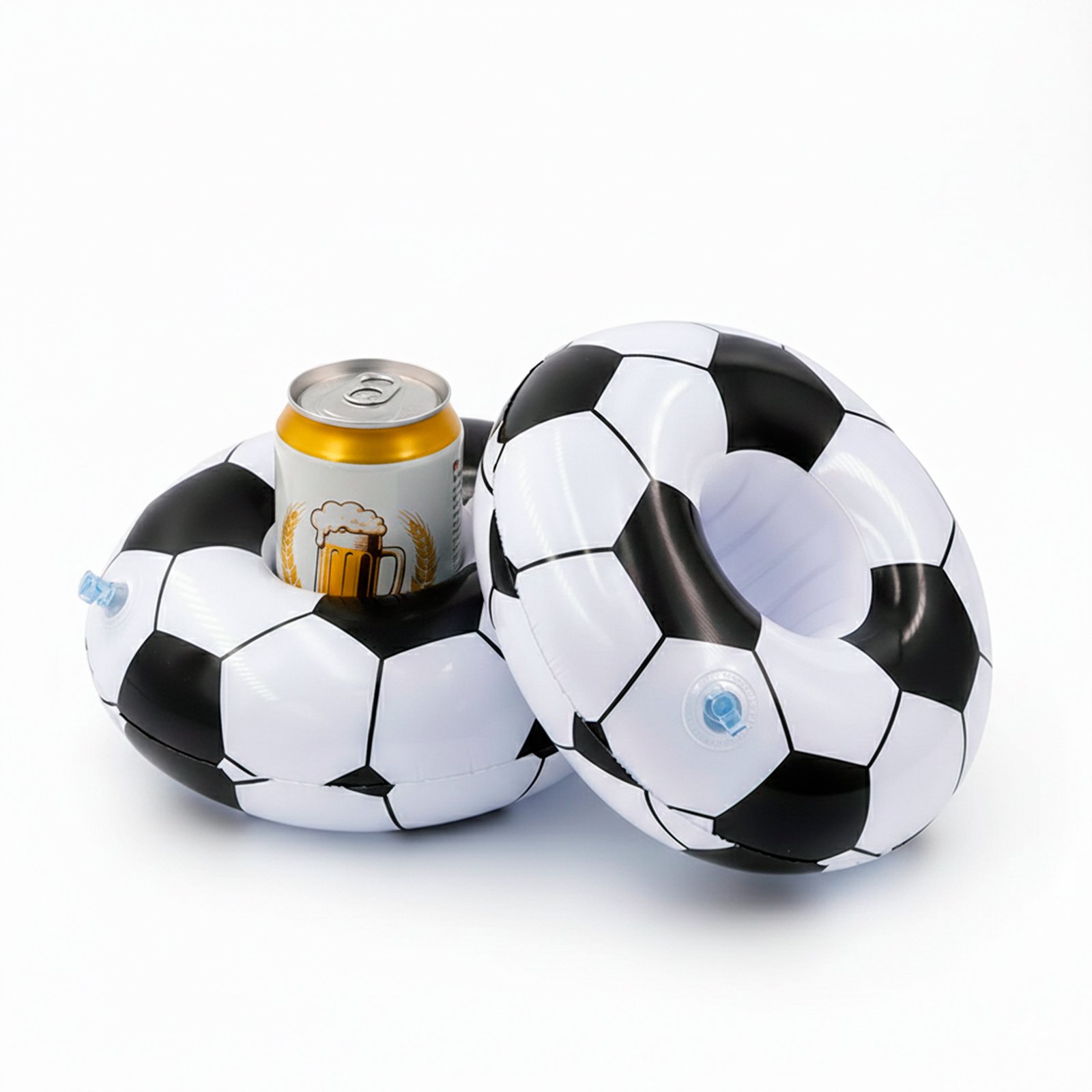 Soporte para bebidas inflable de 1 puesto con estampado de balón de fútbol. De 21cms de diámetro.