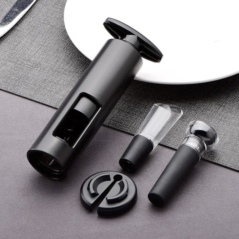 Set de vino de 4 piezas. Saca corchos manual de precisión, cortador de sellos, tapón de vino de vacío y vertedor de vino con aireador.
