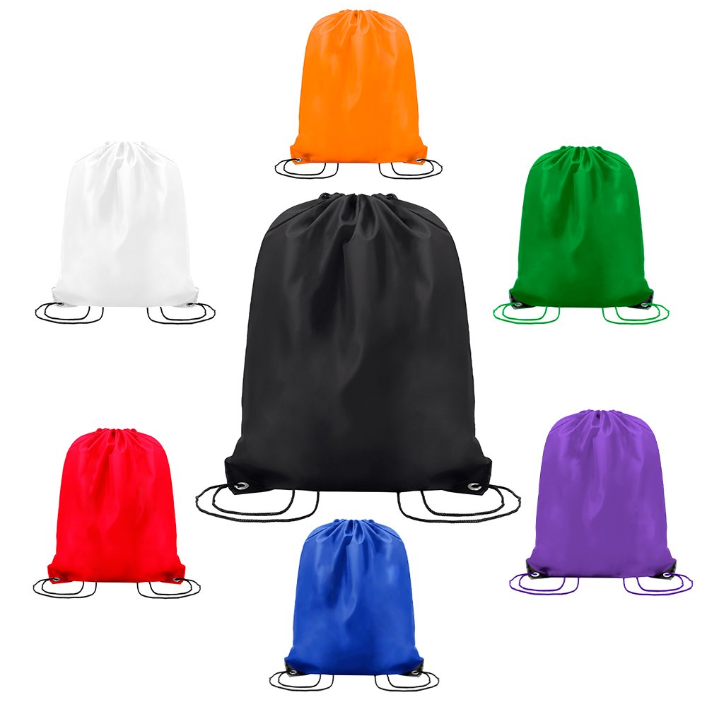 En poliéster 210D impermeable, cordón encerado, refuerzos laterales. De 43,5 X 34,5 cm.